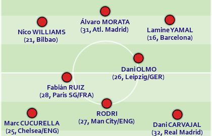 Denn mit Wunderkind Lamine Yamal rechts und dem trickreichen Dribbler Nico Williams links gibt es nun zwei Flügelspieler, die aus den endlosen Passfolgen ausbrechen können, in Eins-gegen-Eins-Duelle gehen, Zug in den Strafraum haben und im Zweifel auch aus größerer Distanz gefährlich abschließen können. Damit ist auch wieder Platz für einen echten Mittelstürmer in Kapitän Álvaro Morata, wenn auch eher in freiblockender Mission als in schießender. Pick-and-Roll, quasi.