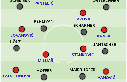 Der kürzlich verstorbene Constantini baute Aleksandar Dragovic (Austria) und Yasin Pehlivan (Rapid) ein, obwohl beide erst eine Handvoll Bundesliga-Spiele in den Beinen hatte, vorne ließ er das grün-weiße Meister-Sturmduo „MaierHoffer“ auflaufen. Michael Gspurning, heute ÖFB-Torwart-Trainer, verursachte nach einem verunglückten Stranzl-Rückpass früh einen Elfmeter, den Milijaš zum 1:0 nützte, danach schwamm sich Österreich aber immer mehr frei.