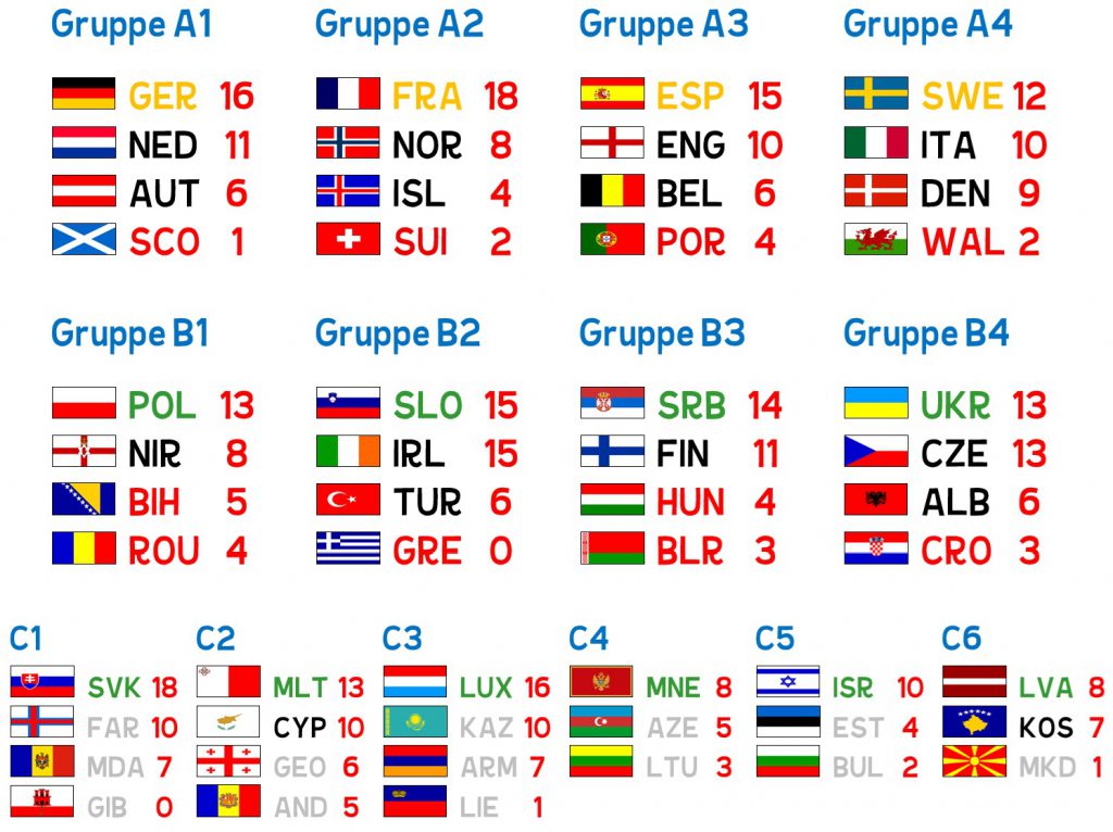 Bei alldem steht darüber jedoch, dass es mittelfristig wohl essenziell wäre, die A-Liga zu halten. Wenn man einmal im Jojo-Status drin ist, wird es umso schwerer, sich wieder oben zu etablieren – das sieht man ja an der Schweiz, die gerade zum zweiten Mal aus der A-Gruppe abgestiegen ist. Aus der B-Gruppe ist der EM-Gastgeber locker wieder aufgestiegen, aber oben – jeweils als Topf-4-Team – gab es in zwölf Spielen einen Sieg, zwei Remis und neun Niederlagen.
