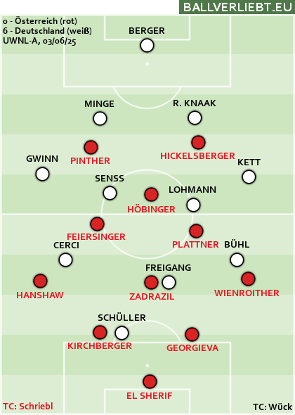 Zu Wenger kamen auch Schasching und Purtscheller ins Spiel, die wie Champions-League-Siegerin Zinsberger nicht in der Start-Elf gestanden waren. Freigang wurde in der Fünferkette besser geschluckt als zuvor, die Flügel konnten nicht mehr so leicht durch Laufwege ins Zentrum hinein österreichische Verlegenheiten in der Zuordnung provozieren. Das ist alles Teil der Wahrheit, ein anderer ist natürlich auch, dass Deutschland den Fuß vom Gaspedal genommen hatte.