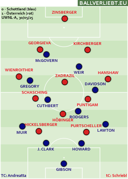 Dass 70 Minuten lang Kontrolle ausgeübt werden konnte, lag auch an einem ziemlich banalen Umstand: Schottland ist nicht Deutschland. Die Schottinnen haben so gar nichts angeboten – sie liefen nicht an, waren nicht in den Zweikämpfen, spielerische Lösungen waren inexistent. Im Zentrum des 4-4-1-1 agierten Cuthbert und Rodgers nicht nebeneinander, sondern versetzt. Die Mittelfeld-Außen rückten weit in die Halbfelder ein – wohl um zu verhindern, wie in Ried vom dichten österreichischen Zentrum überrannt zu werden.