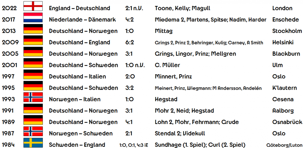 Die Frauen-EM von 2005 in England wurde beinahe versteckt, man brauchte keine zwei Autostunden, um alle vier Haupt-Spielorte in Merseyside und Lancashire abzuklappern. 2009 in Finnland, das erste Turnier mit zwölf Teams, zeigte den Willen von der UEFA, litt aber unter dem überwiegend kargen Interesse vor Ort und dem späten Zeitpunkt Anfang September. 2013 in Schweden sorgte der Gastgeber für eine spürbare Begeisterung im Land, sportlich war es aber noch eher old-school. 2017 in den Niederlanden, erstmals mit 16 Teams, war der Professionalisierungsschub in Europa dann erstmals auch auf einer sichtbaren Breite durch eine gesteigerte Athletik am Rasen zu sehen. Und 2022, wiederum in England, war auch das Niveau der TV-Produktion nicht mehr von jener einer Männer-EM zu unterscheiden.