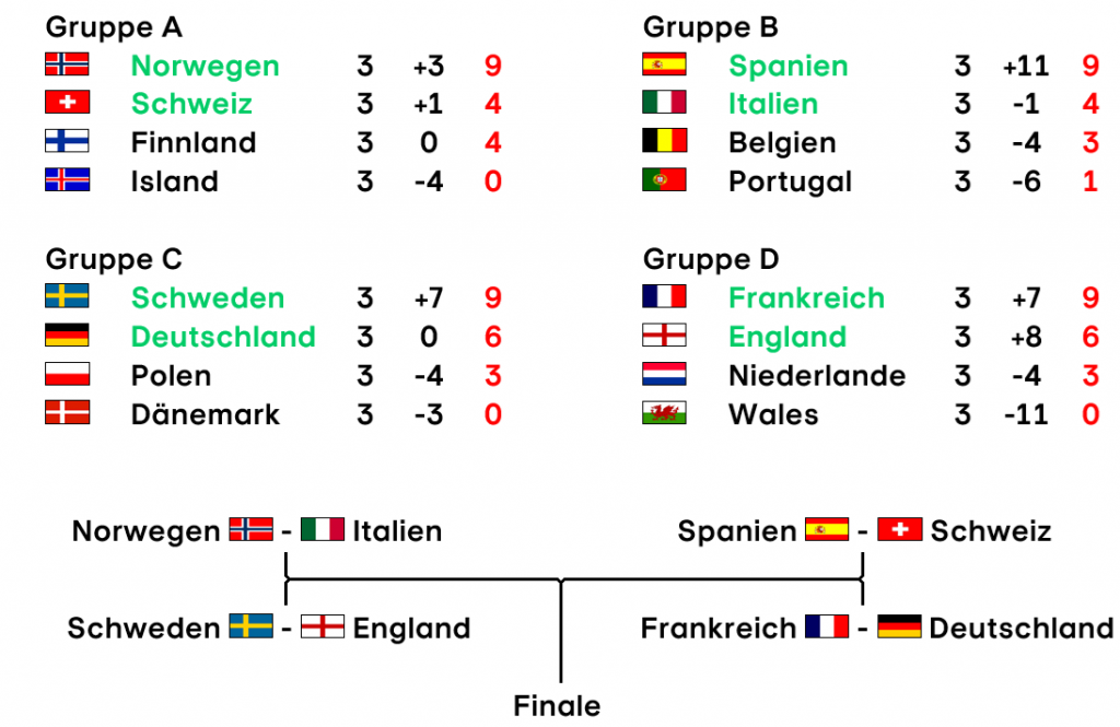 Nun hat Frankreich bisher einen eher zwiespältigen Eindruck hinterlassen: Der Machtdemonstration gegen England folgte die etwas gelangweilte Vorstellung beim 4:1 gegen Wales, bei dem zahlreiche Stammkräfte schon geschont wurden. Gegen die Niederlande behinderte man sich selbst, weil Oriane Jean-François als Manndeckerin für Jackie Groenen aufgestellt wurde. So konnte Frankreich nicht den gewohnten Druck auf die gegnerische Spieleröffnung ausüben und ließ Löcher im Zentrum, welche die Niederlande bespielen konnten.