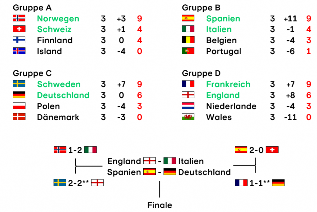 Die Naivität, mit der sich Deutschland schon in personellem Gleichstand von Schweden die Laufwege manipulieren und das Mittelfeld aufreißen ließ, war bedenklich, aber nichts davon war gegen Frankreich ausschlaggebend und das wird es höchstwahrscheinlich auch im Halbfinale gegen Spanien nicht sein. Nicht umsonst hat Spanien noch nie gegen Deutschland gewonnen.