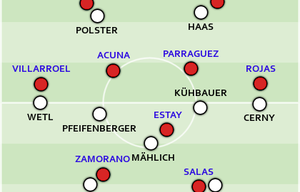 Parraguez nervte Kühbauer, Pfeifenberger kam gegen Acuña nicht zur Geltung und Feiersinger rückte nach 20 Minuten zwar vermehrt auf, um einen zusätzlichen Mann im Zentrum zu haben – die Antreiber-Antritte von Feiersinger verpufften jedoch, weil auch er keine Anspielstationen fand. So war es Mählich, der eine Doppelrolle als Estay-Kettenhund und Österreich-Spieleröffner inne hatte.