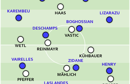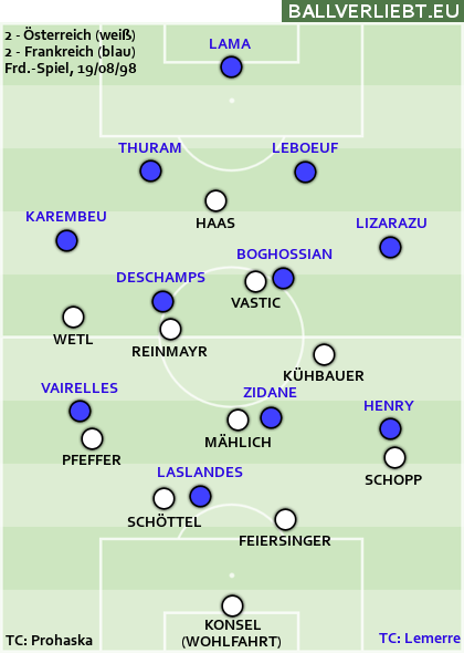 Für die zweite Halbzeit des Treffens in Wien blieben Zidane, Lizarazu und Deschamps in der Kabine (es kamen Djorkaeff, Candela und Déhu) und auch Herbert Prohaska baute ein wenig um: Peter Stöger (statt Kühbauer im Spiel) besetzte nun die rechte Seite vor Markus Hiden, der anstelle von Schopp die Agenden als Henry-Manndecker übernahm.