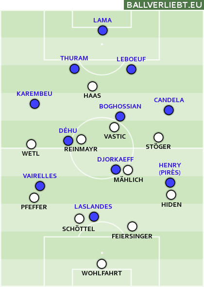 Durch das französische 4-2-3-1 war Schopp als Manndecker gegen Henry hinten gebunden und Österreich fehlte quasi komplett die rechte Seite. Mählich – der bei der WM der effektivste Spieleröffner gewesen war – war mit der Bewachung von Zidane vollauf beschäftigt. Davon abgesehen begann das ÖFB-Team aber durchaus forsch. Ein spürbarer Gegensatz zu den extrem vorsichtigen Anfangsphasen in allen drei WM-Spielen.